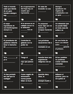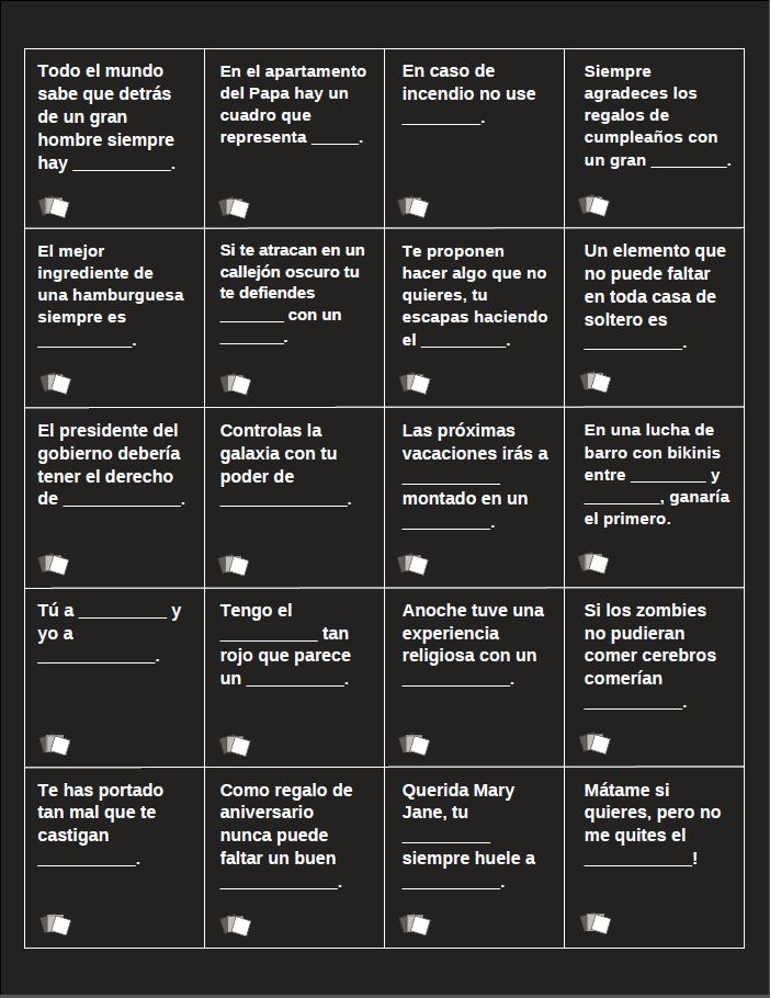 Lo bueno de éste juego, es que podéis customizarlo al máximo, añadiendo o quitando cartas (dependiendo de vuestros gustos y sensibilidades), y creando las vuestras propias! Podéis descargar las cartas en blanco desde la propia página web, aunque hay un par de webs que nos facilitan la labor... yo os dejo el link a una: